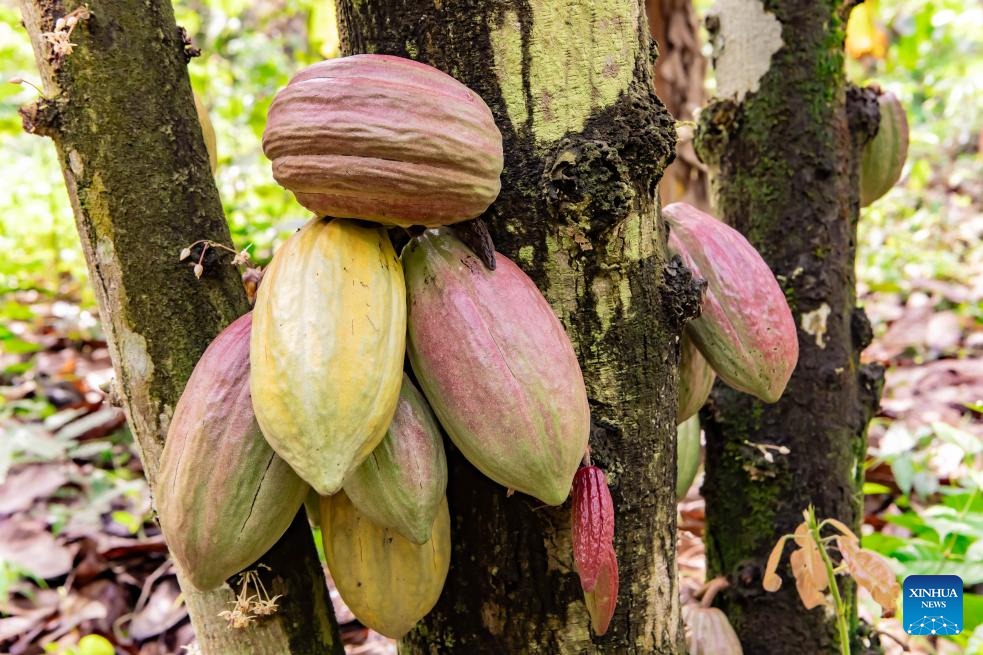This photo taken on April 8, 2026 shows cocoa pods at a plantation on the outskirts of Buea, capital of the Southwest Region of Cameroon. (Photo by Muleng Timngum/Xinhua)
