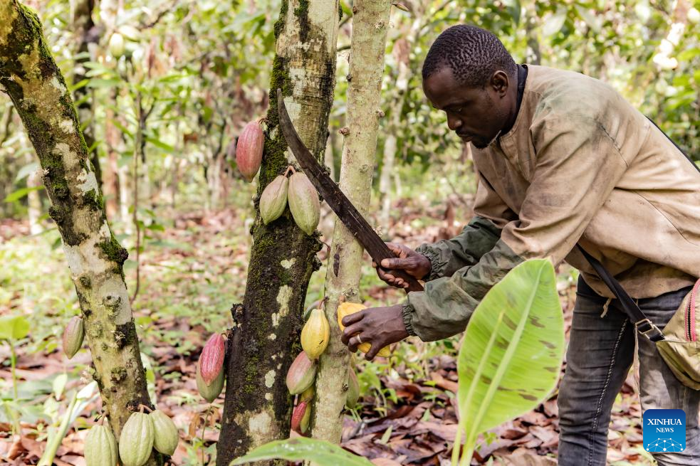 Sekiss Enyeh Bayere harvests a cocoa pod at his plantation on the outskirts of Buea, capital of the Southwest Region of Cameroon, April 8, 2026. (Photo by Muleng Timngum/Xinhua)