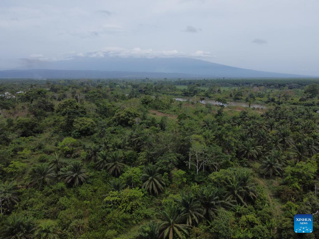 An aerial drone photo taken on April 8, 2026 shows a view of a cocoa plantation on the outskirts of Buea, capital of the Southwest Region of Cameroon. (Photo by Muleng Timngum/Xinhua)