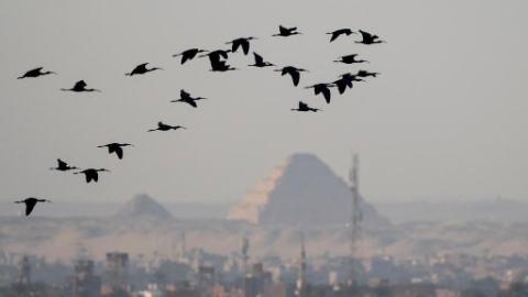 Migratory birds fly above Giza, Eygpt
