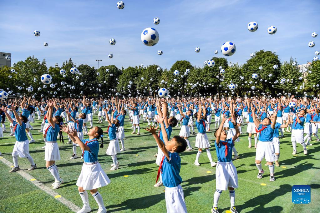 Photo taken on Dec. 1, 2021 shows children performing group calisthenics in Binhu Road Primary School in Nanning, south China's Guangxi Zhuang Autonomous Region. On Dec. 1, the Binhu Road Primary School held the opening ceremony of "sports culture festival". A number of activities were held for the festival, such as group calisthenics performances and sports competitions. This allows the children to get out of the classroom, enjoy the sunshine, and partake in the joy of sports. (Xinhua/Cao Yiming)