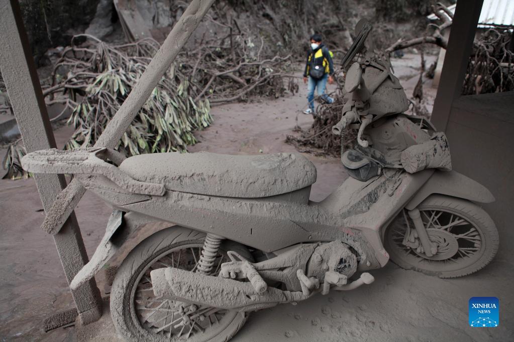 A motorbike is covered with volcanic ashes after Mount Semeru eruption at Sumberwuluh village in Lumajang, East Java, Indonesia, Dec. 5, 2021. Semeru volcano erupted on Saturday, leaving a person killed, two people missing and 40 others injured, a local official told a joint virtual press conference. (Photo by Bayu Novanta/Xinhua)