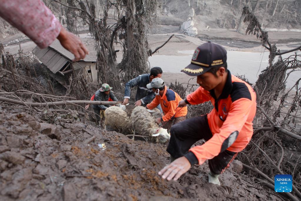 Rescuers evacuate sheep after Mount Semeru eruption at Sumberwuluh village in Lumajang, East Java, Indonesia, Dec. 5, 2021. Semeru volcano erupted on Saturday, leaving a person killed, two people missing and 40 others injured, a local official told a joint virtual press conference. (Photo by Bayu Novanta/Xinhua)