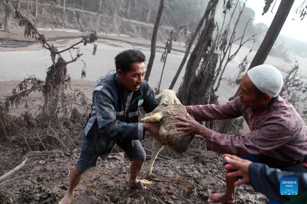 People evacuate a sheep after Mount Semeru eruption at Sumberwuluh village in Lumajang, East Java, Indonesia, Dec. 5, 2021. Semeru volcano erupted on Saturday, leaving a person killed, two people missing and 40 others injured, a local official told a joint virtual press conference. (Photo by Bayu Novanta/Xinhua)