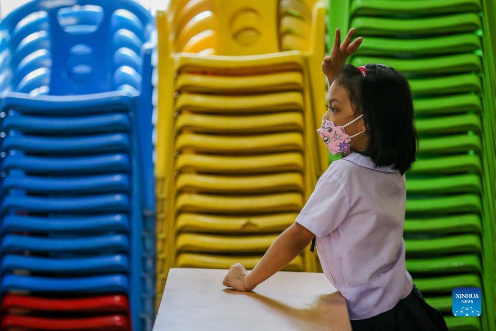 A student wearing a protective mask raises her hand during a face-to-face class at an elementary school in Quezon City, the Philippines, Dec. 6, 2021. Selected schools in the Philippines on Monday started the pilot run of limited face-to-face classes as the country continues to record declining COVID-19 cases. (Xinhua/Rouelle Umali)