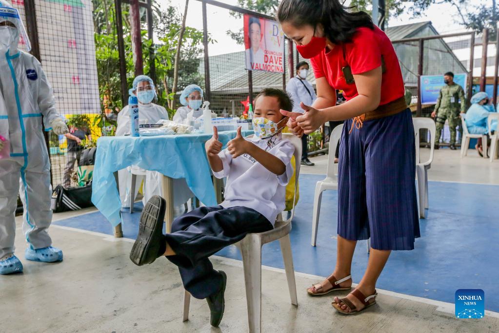 A student wearing a face mask gestures after undergoing a voluntary COVID-19 test before attending a face-to-face class at an elementary school in Quezon City, the Philippines, Dec. 6, 2021. Selected schools in the Philippines on Monday started the pilot run of limited face-to-face classes as the country continues to record declining COVID-19 cases. (Xinhua/Rouelle Umali)