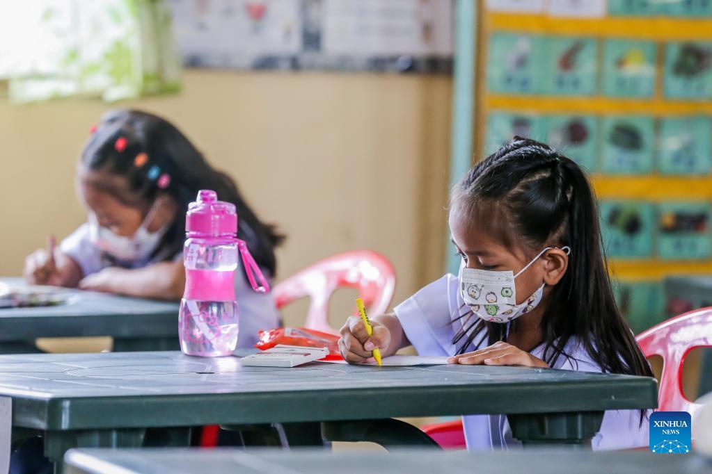 Students wearing protective masks attend a face-to-face class at an elementary school in Quezon City, the Philippines, Dec. 6, 2021. Selected schools in the Philippines on Monday started the pilot run of limited face-to-face classes as the country continues to record declining COVID-19 cases. (Xinhua/Rouelle Umali)