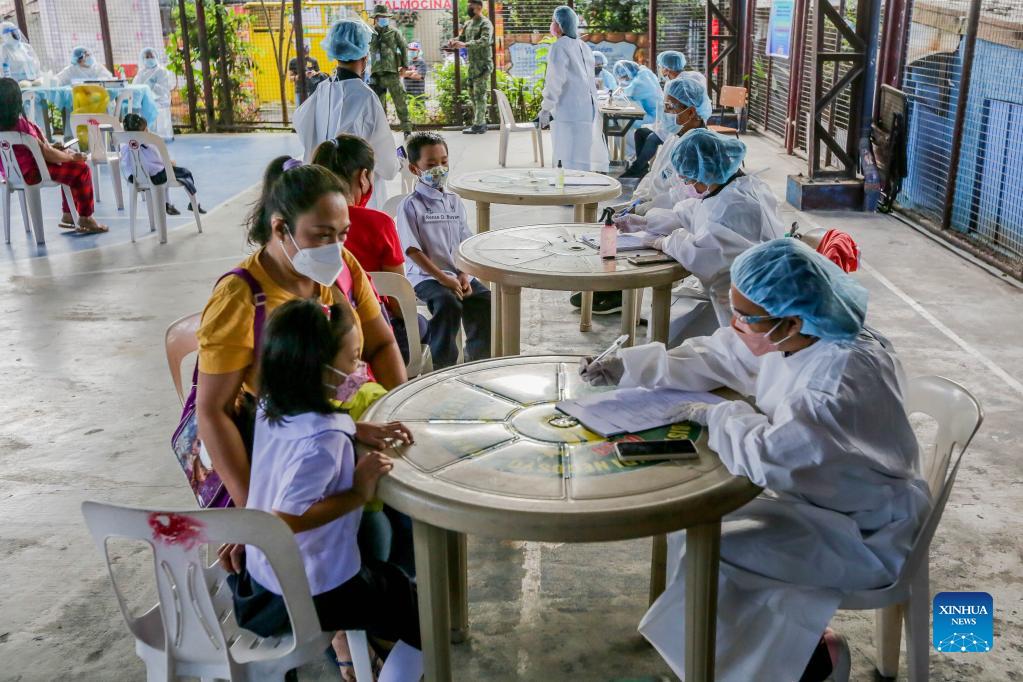 Students wearing protective masks are assisted by their parents as they undergo a voluntary COVID-19 antigen test before attending a face-to-face class at an elementary school in Quezon City, the Philippines, Dec. 6, 2021. Selected schools in the Philippines on Monday started the pilot run of limited face-to-face classes as the country continues to record declining COVID-19 cases. (Xinhua/Rouelle Umali)