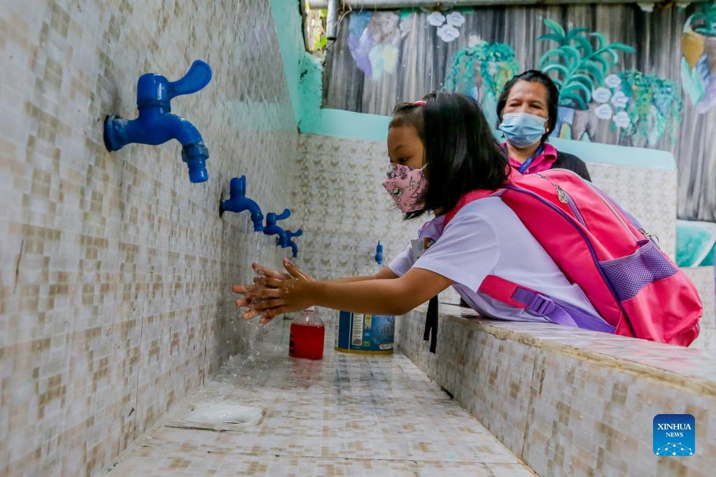 A student wearing a protective mask washes her hands before attending a face-to-face class at an elementary school in Quezon City, the Philippines, Dec. 6, 2021. Selected schools in the Philippines on Monday started the pilot run of limited face-to-face classes as the country continues to record declining COVID-19 cases. (Xinhua/Rouelle Umali)