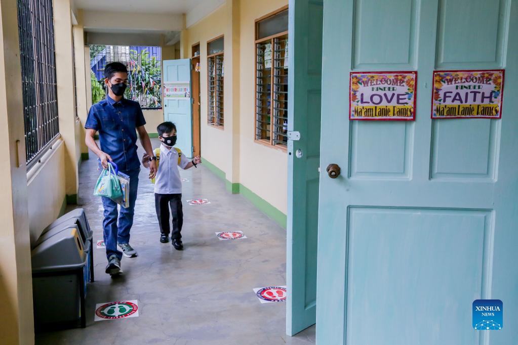 A student wearing a protective mask is assisted by a school employee to his classroom to attend a face-to-face class at an elementary school in Quezon City, the Philippines, Dec. 6, 2021. Selected schools in the Philippines on Monday started the pilot run of limited face-to-face classes as the country continues to record declining COVID-19 cases. (Xinhua/Rouelle Umali)
