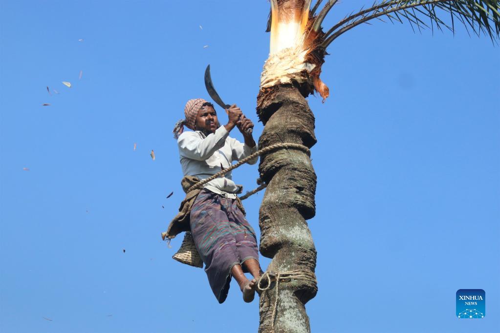 A date collector cuts into a date palm tree to collect materials for molasses at a village in Jashore, Bangladesh, Dec. 6, 2021. Molasses made of date palm fruits is a traditional delicacy in Bangladesh. It also serves as a basic ingredient for making traditional sweets in winter. (Xinhua)