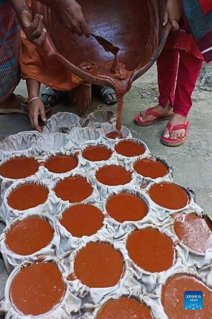 Photo taken on Dec. 6, 2021 shows plates of molasses made of date palm fruits at a village in Magura, Bangladesh. Molasses made of date palm fruits is a traditional delicacy in Bangladesh. It also serves as a basic ingredient for making traditional sweets in winter. (Xinhua)
