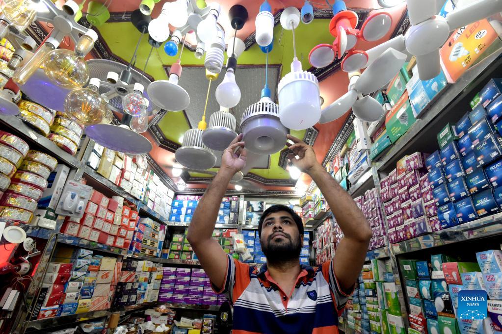A vendor fixes energy efficient bulb light at a store in a mega wholesale market in Dhaka, Bangladesh on Nov. 24, 2021. Customers bustled round in one of Bangladesh's largest wholesale market places Nawabpur in capital Dhaka, buying solar panels and accessories for their houses or farms ahead of rice cultivation season. (Xinhua)