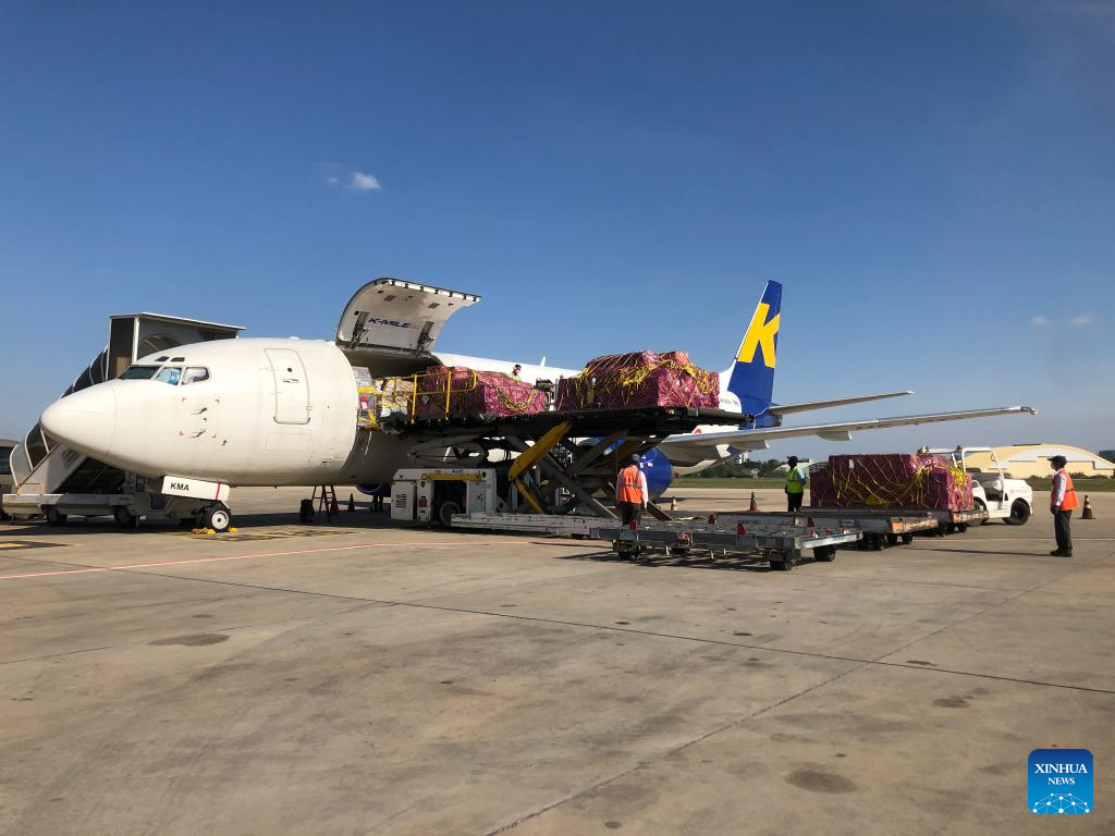 Staff members unload cargos from a plane at the Phnom Penh International Airport in Phnom Penh, Cambodia, Dec. 31, 2021. (Photo by Van Pov/Xinhua)