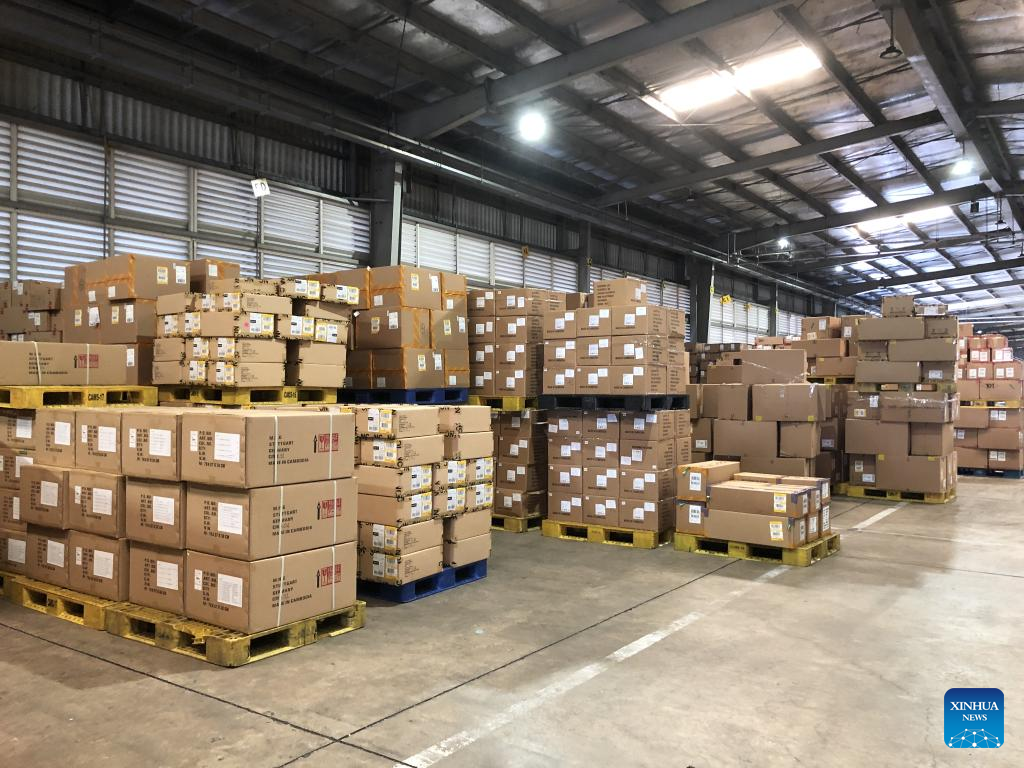 Photo taken on Dec. 31, 2021 shows cargos stored at the Phnom Penh International Airport's warehouse in Phnom Penh, Cambodia. (Photo by Van Pov/Xinhua)