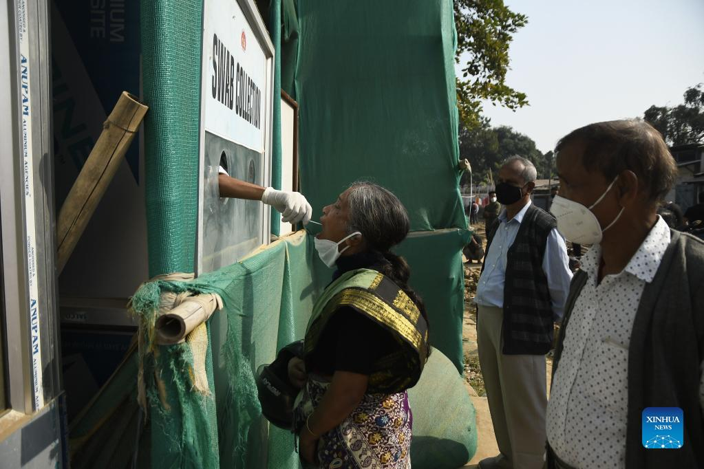 A health worker takes a swab sample from a woman to test with Rapid Antigen Test (RAT) for COVID-19 in Guwahati city of India's northeastern state of Assam, Jan. 9, 2022. India Sunday reported 159,632 new COVID-19 cases, which is over a five-fold increase since the beginning of the new year. On Jan. 1, the total number of new cases was only 27,553. (Str/Xinhua)
