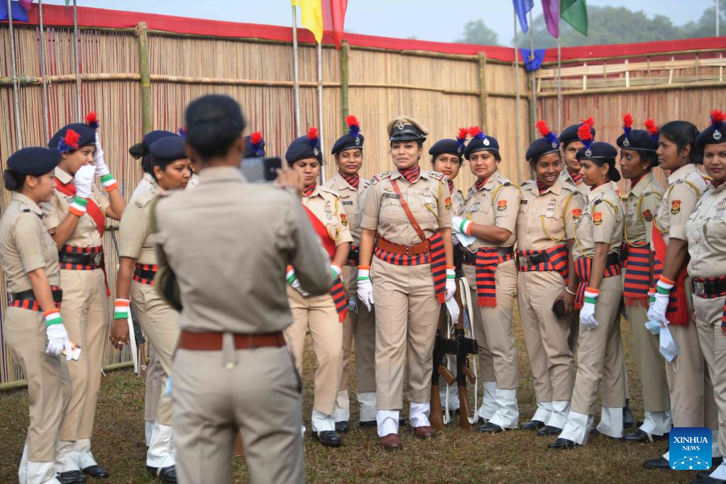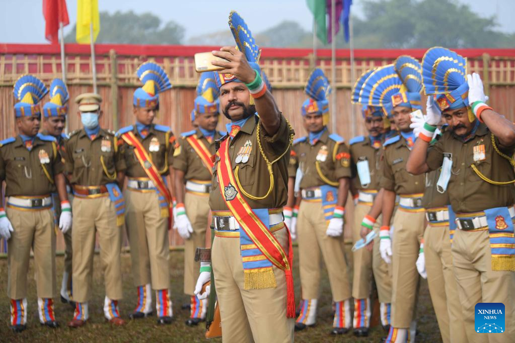 Soldiers take photos before parade on the occasion of the 73rd Republic Day celebration at Assam Rifles ground in Agartala, the capital city of India's northeastern state of Tripura, Jan. 26, 2022. (Str/Xinhua)