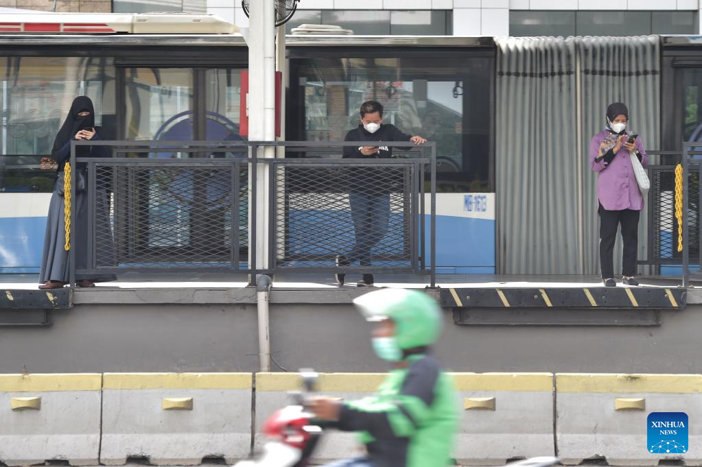 People use their mobile phones at a bus stop in Jakarta, Indonesia, Feb. 7, 2022. Indonesia's economy in 2021 grew 3.69 percent, compared with a 2.07-percent contraction in the previous year, the Statistics Indonesia (BPS) said Monday on a virtual press conference. (Xinhua/Veri Sanovri)
