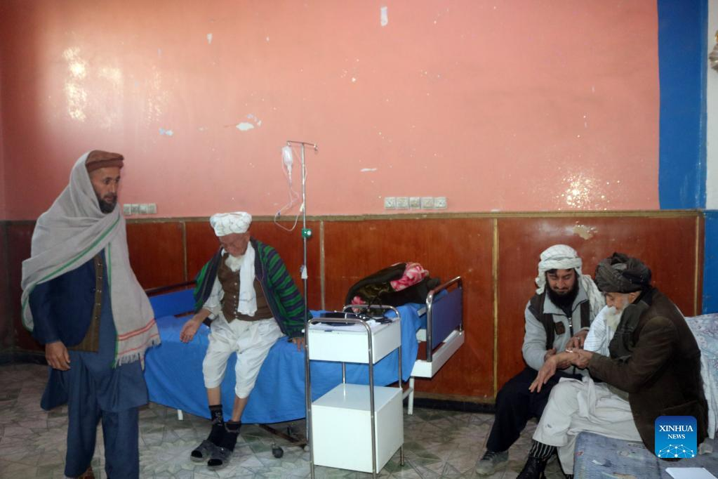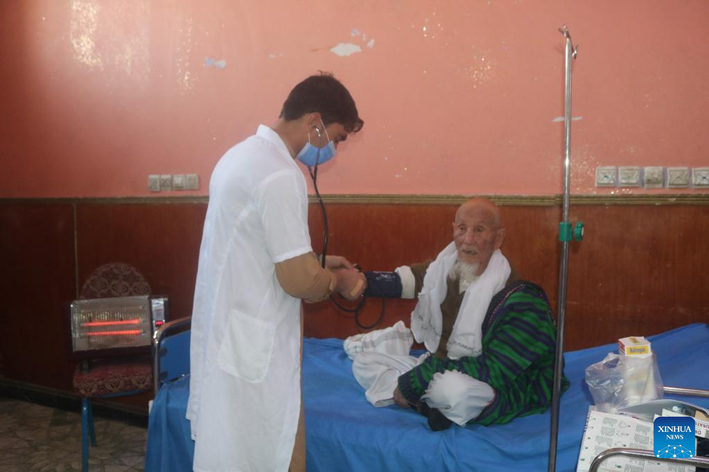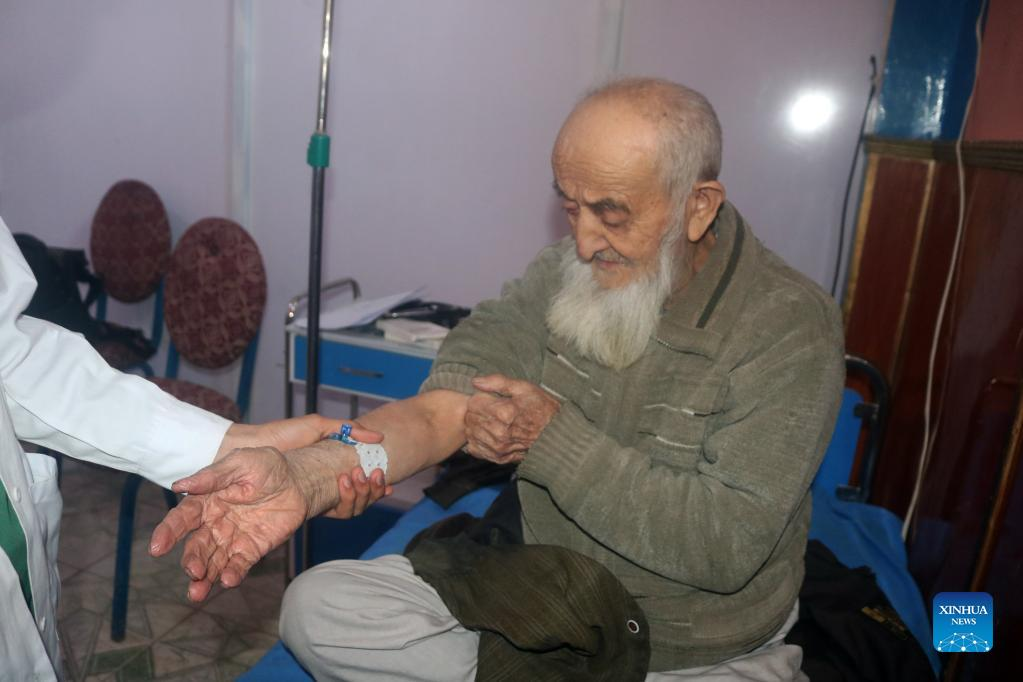 Afghan nurses check a man at Hawa Save House in Kunduz city, Afghanistan, Jan. 31, 2022. The Hawa Save House is the first daycare facility for the elderly established since the U.S. occupation ended last year. It has the support of four private health clinics, and more than 30 doctors and nurses work there. (Str/Xinhua)