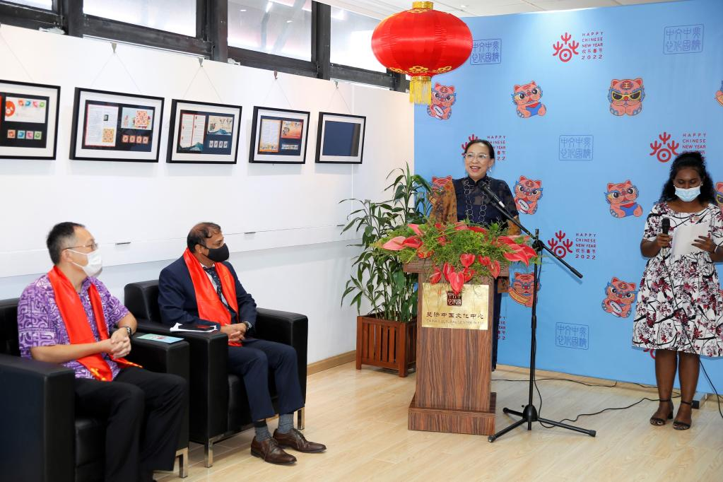 Han Xiaoyan, director of the China Cultural Center in Fiji, speaks at the launching ceremony for the Year of the Tiger stamps at the China Cultural Center in Fiji, in Suva, Fiji, on Feb. 15, 2022. The China Cultural Center in Fiji and Post Fiji jointly launched the Year of the Tiger stamps on Tuesday in celebration of the Chinese Lunar New Year. (Xinhua/Zhang Yongxing)