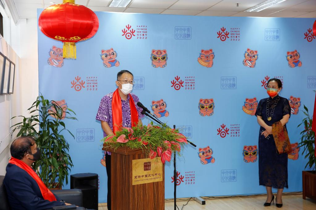 Wang Xuguang, counselor of the Chinese Embassy in Fiji, speaks at the launching ceremony for the Year of the Tiger stamps at the China Cultural Center in Fiji, in Suva, Fiji, on Feb. 15, 2022. The China Cultural Center in Fiji and Post Fiji jointly launched the Year of the Tiger stamps on Tuesday in celebration of the Chinese Lunar New Year. (Xinhua/Zhang Yongxing)
