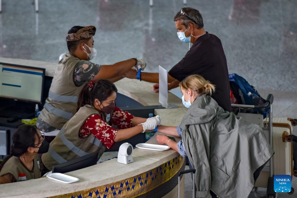 Staff members give bracelets for international travelers after arriving at Ngurah Rai International Airport in Bali, Indonesia, Feb. 16, 2022. International travelers who have received COVID-19 booster vaccines are allowed to enter Indonesia with a three-day quarantine period, Coordinating Minister for Maritime and Investment Affairs Luhut Binsar Pandjaitan said on Monday. (Photo by Bisinglasi/Xinhua)