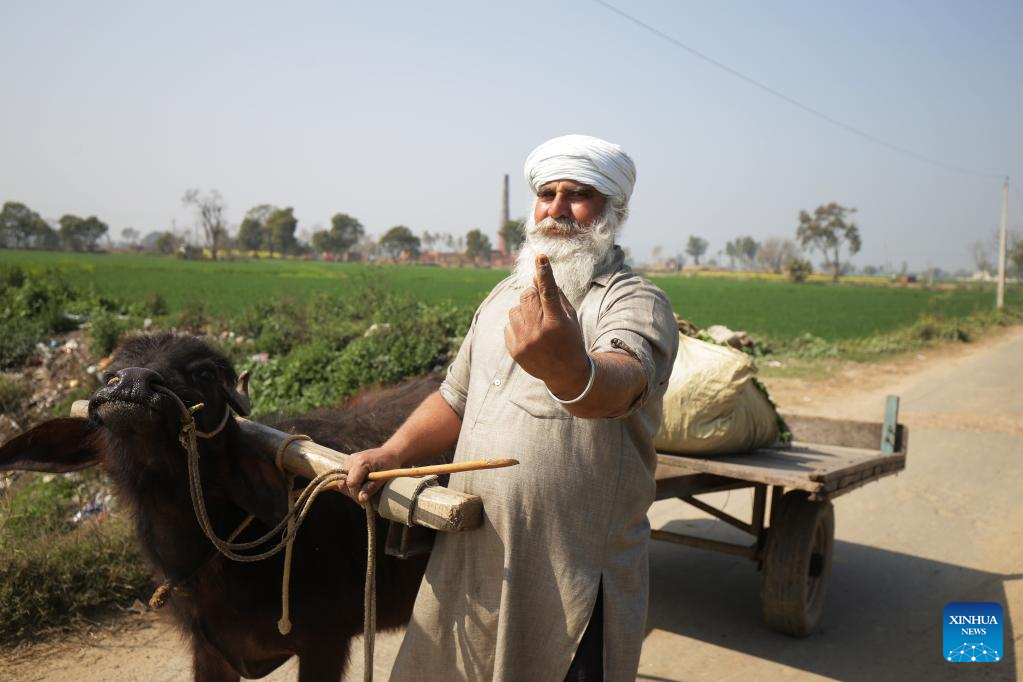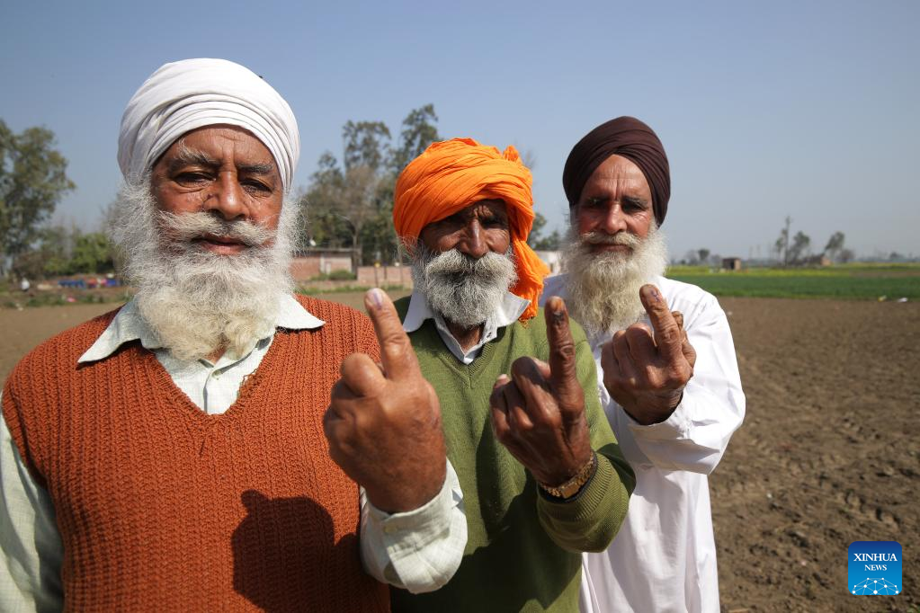 A voter shows his inked finger after casting his vote for the Assembly elections of Punjab at Bhagwaan village in Amritsar district of India's northern Punjab state, Feb. 20, 2022. Voting for local elections is underway in two Indian states of Punjab and Uttar Pradesh, officials said Sunday. (Str/Xinhua)