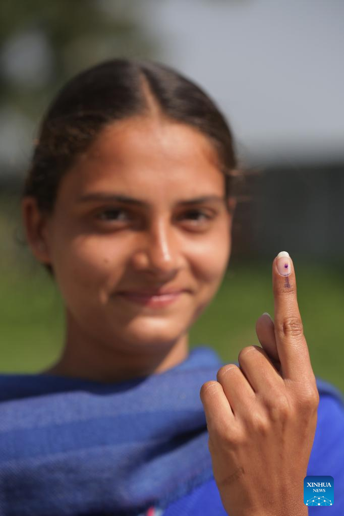 A voter shows her inked finger after casting her vote at a polling booth for the Assembly elections of Punjab at Bhagwaan village in Amritsar district of India's northern Punjab state, Feb. 20, 2022. Voting for local elections is underway in two Indian states of Punjab and Uttar Pradesh, officials said Sunday. (Str/Xinhua)