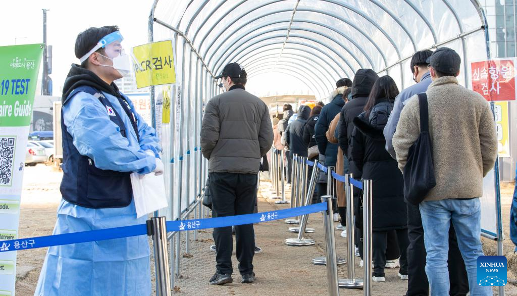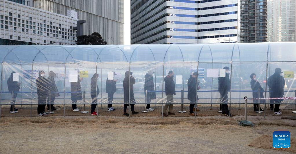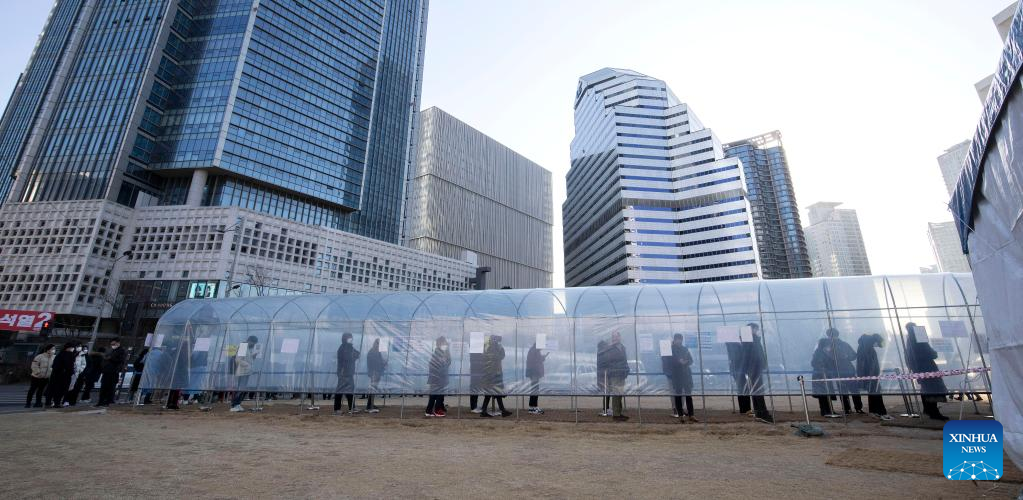 People wait for COVID-19 test at a makeshift testing site in Seoul, South Korea, Feb. 24, 2022. South Korea reported 170,016 new COVID-19 cases as of midnight Wednesday compared to 24 hours ago, raising the total number of infections to 2,499,188, the health authorities said Thursday. (Photo by James Lee/Xinhua)