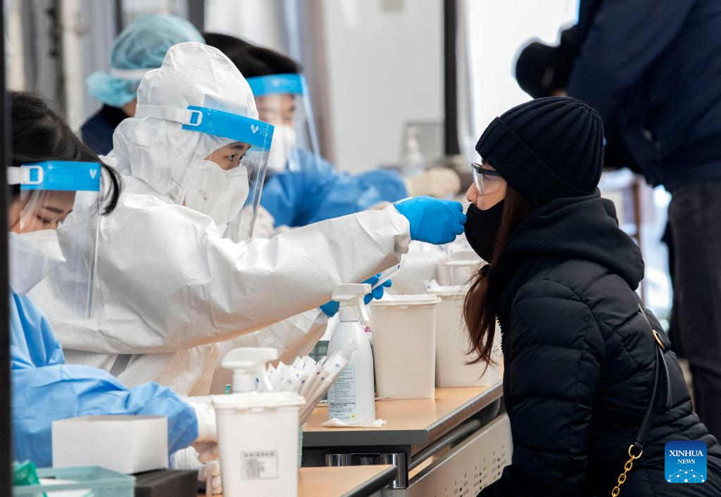 A medical worker takes a nasal swab sample from a woman for COVID-19 tests at a makeshift testing site in Seoul, South Korea, Feb. 24, 2022. South Korea reported 170,016 new COVID-19 cases as of midnight Wednesday compared to 24 hours ago, raising the total number of infections to 2,499,188, the health authorities said Thursday. (Photo by James Lee/Xinhua)