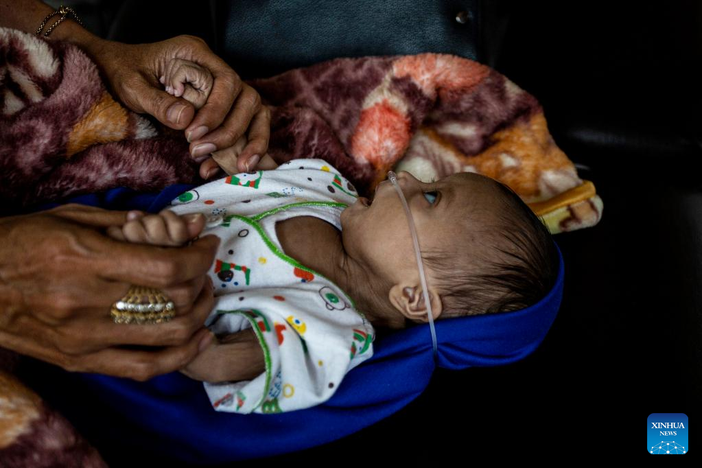 A baby receives medical treatment in Ibnu Sina hospital yard in Pasaman Barat district, West Sumatra, Indonesia, Feb. 26, 2022. Seven people were killed and 85 others wounded as a 6.1-magnitude quake destroyed over 10,000 buildings, houses and infrastructure facilities in Indonesia's western province of West Sumatra on Friday, a senior official said. (Photo by Andry Mardiansyah/Xinhua)