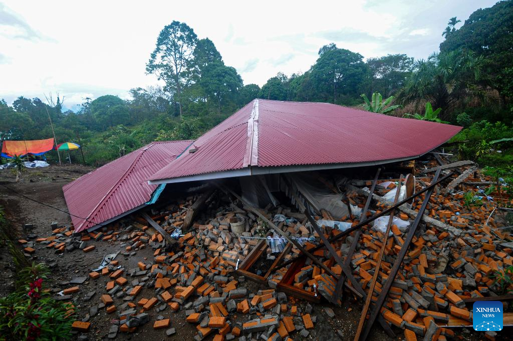 Photo taken on Feb. 25, 2022 shows a damaged house after an earthquake at Talamau village in Pasaman Barat district, West Sumatra, Indonesia. Seven people were killed and 85 others wounded as a 6.1-magnitude quake destroyed over 10,000 buildings, houses and infrastructure facilities in Indonesia's western province of West Sumatra on Friday, a senior official said. (Photo by Ardhy Fernando/Xinhua)