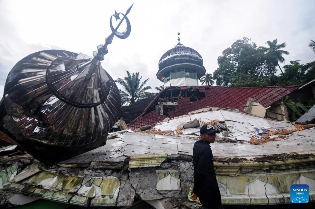 A man stands near a damaged house after an earthquake at Talamau village in Pasaman Barat district, West Sumatra, Indonesia, Feb. 25, 2022. Seven people were killed and 85 others wounded as a 6.1-magnitude quake destroyed over 10,000 buildings, houses and infrastructure facilities in Indonesia's western province of West Sumatra on Friday, a senior official said. (Photo by Ardhy Fernando/Xinhua)