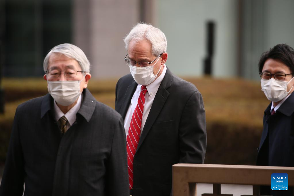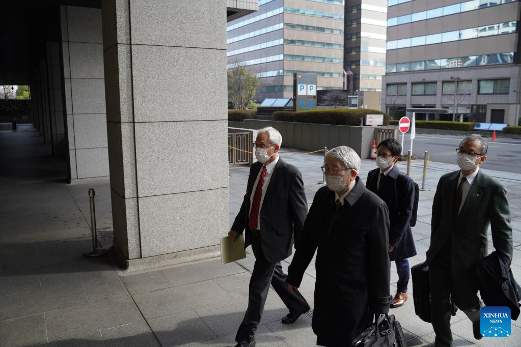 Former Nissan Motor Co. executive Greg Kelly (1st L) walks into the Tokyo District Court in Tokyo, Japan on March 3, 2022. Former Nissan Motor Co. executive Greg Kelly and the automaker itself were found guilty Thursday on charges connected to the underreporting of ex-CEO Carlos Ghosn's pay. The former Nissan representative director was sentenced by the Tokyo District Court to six months in prison, suspended for three years. (Xinhua/Zhang Xiaoyu)