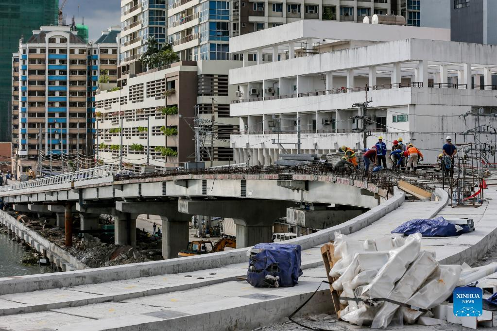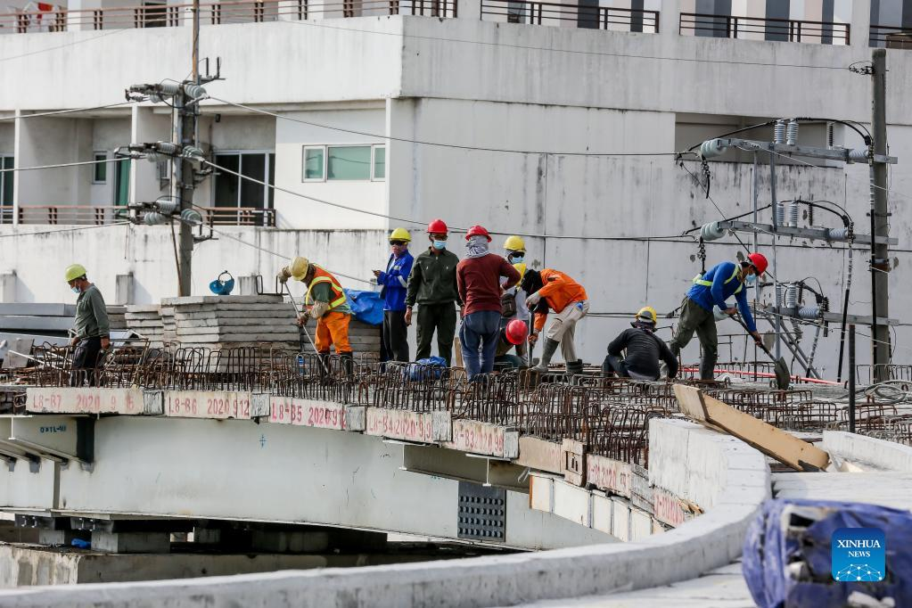 Workers are seen on the construction site of the China-funded Binondo-Intramuros Bridge in Manila, the Philippines on March 3, 2022. The Binondo-Intramuros Bridge is a steel bowstring arch bridge in Manila City that will connect the Intramuros side and Binondo side over the Pasig River. (Xinhua/Rouelle Umali)