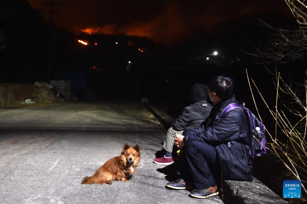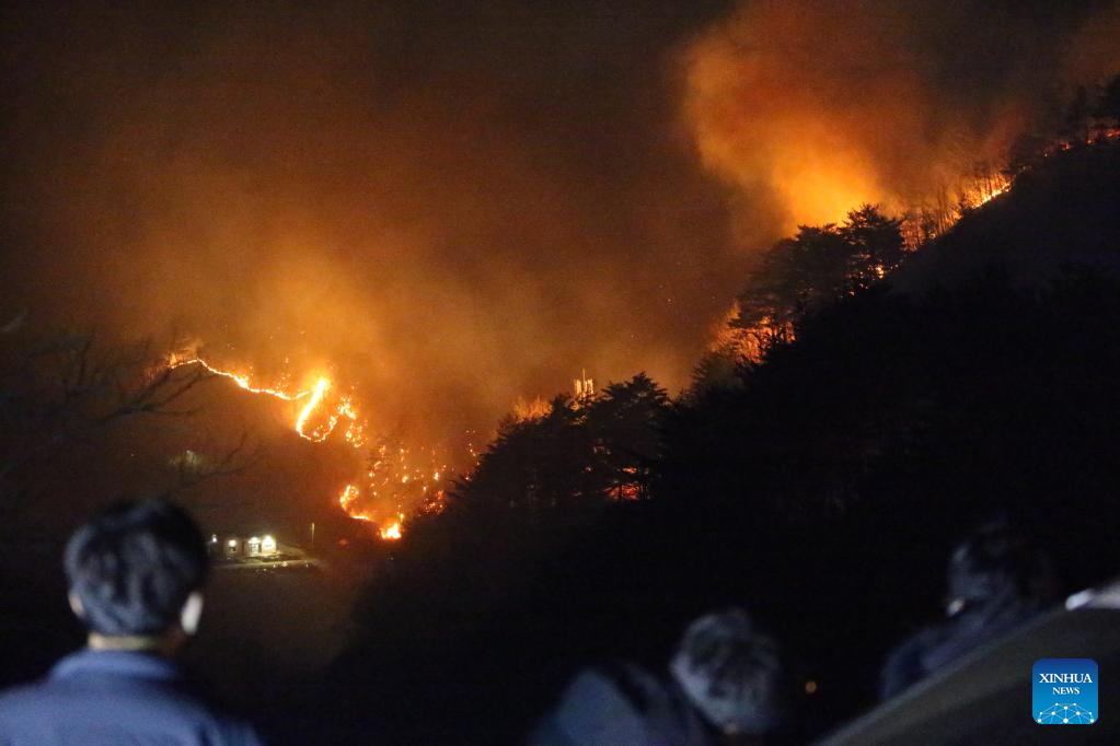 People look at the wildfire in North Gyeongsang Province, South Korea, March 4, 2022. (NEWSIS/Handout via Xinhua)