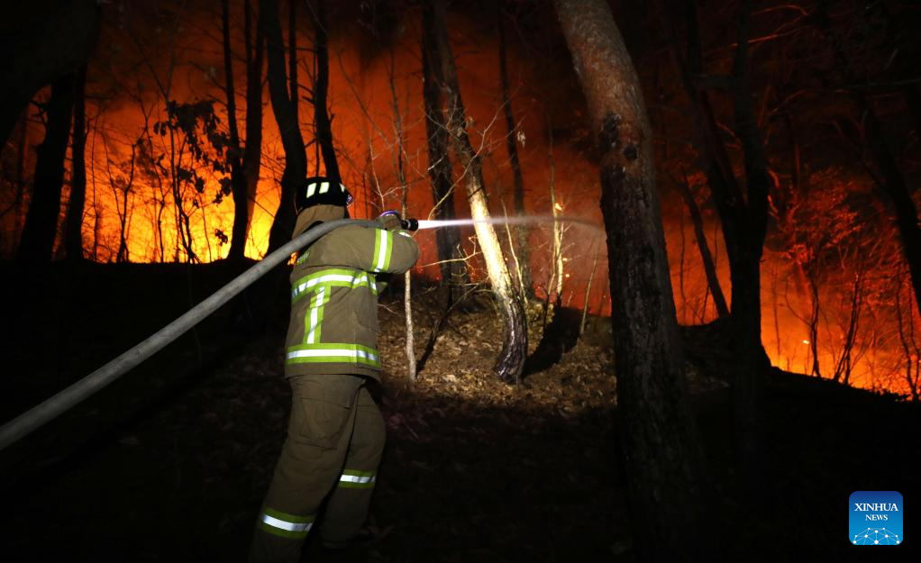 A firefighter works to extinguish a wildfire in North Gyeongsang Province, South Korea, March 4, 2022. (NEWSIS/Handout via Xinhua)