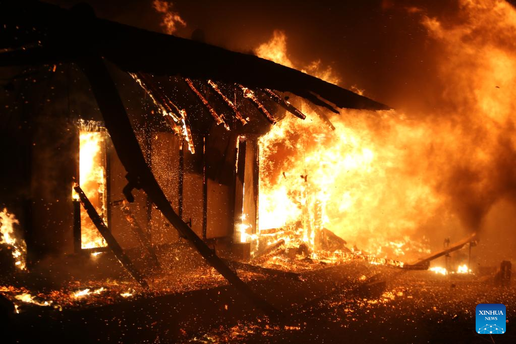 A house is burnt down by the wildfire in Gangwon Province, South Korea, March 5, 2022. (NEWSIS/Handout via Xinhua)