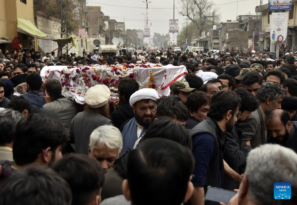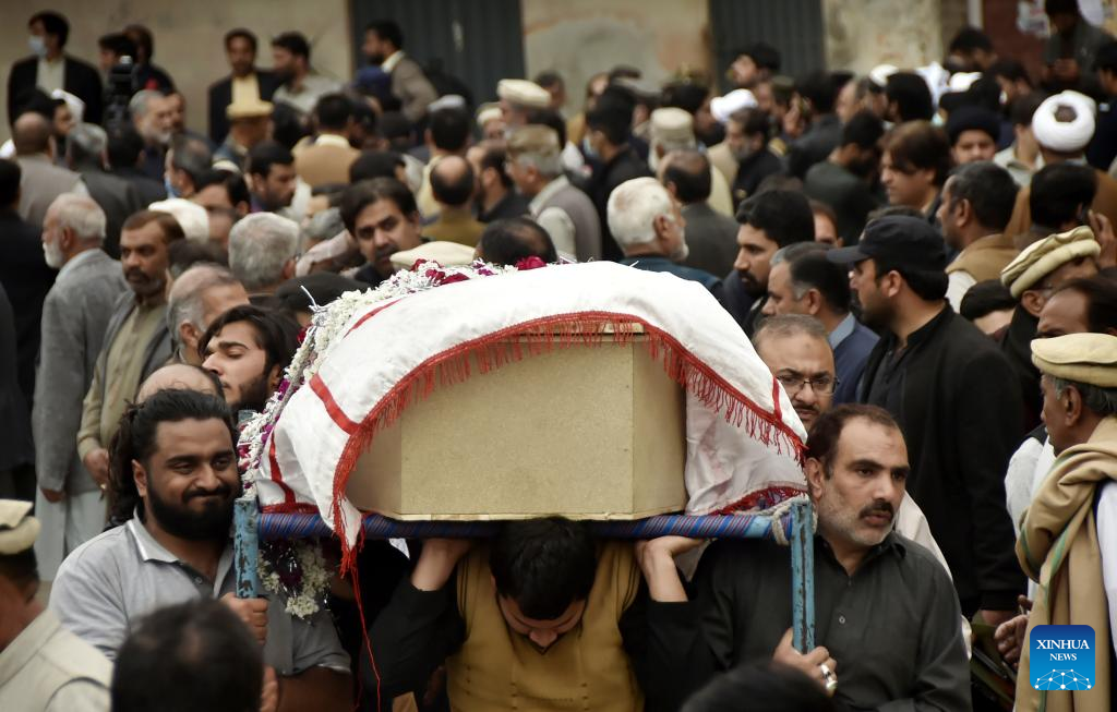 People attend a funeral ceremony of victims following a blast in northwest Pakistan's Peshawar on March 5, 2022. A powerful blast hit a mosque in Pakistan's northwestern city of Peshawar in Khyber Pakhtunkhwa province on Friday.