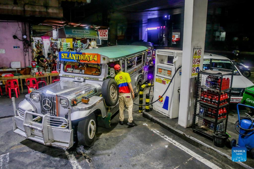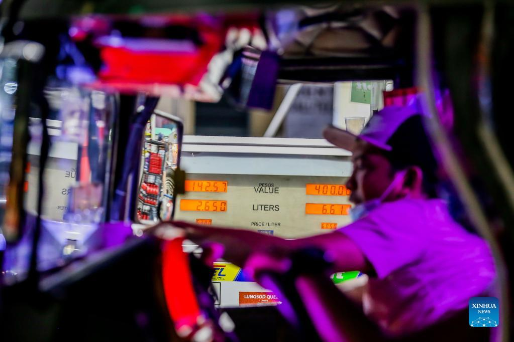 A worker refuels a jeepney at midnight in Quezon City, the Philippines, March 7, 2022. On Tuesday, oil companies imposed another round of fuel hikes in the Southeast Asian country. (Xinhua/Rouelle Umali)