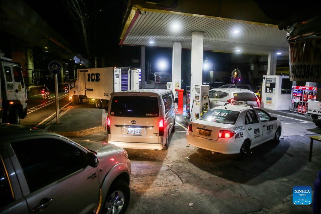 Drivers line up to refuel their vehicles at midnight in Quezon City, the Philippines, March 7, 2022. On Tuesday, oil companies imposed another round of fuel hikes in the Southeast Asian country. (Xinhua/Rouelle Umali)