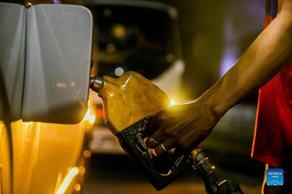 A worker refuels a vehicle at midnight in Quezon City, the Philippines, March 7, 2022. On Tuesday, oil companies imposed another round of fuel hikes in the Southeast Asian country. (Xinhua/Rouelle Umali)