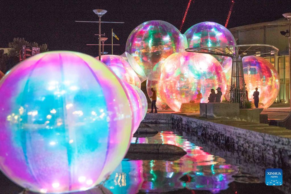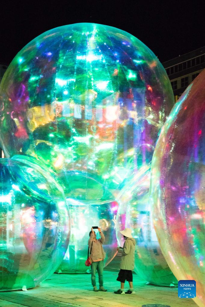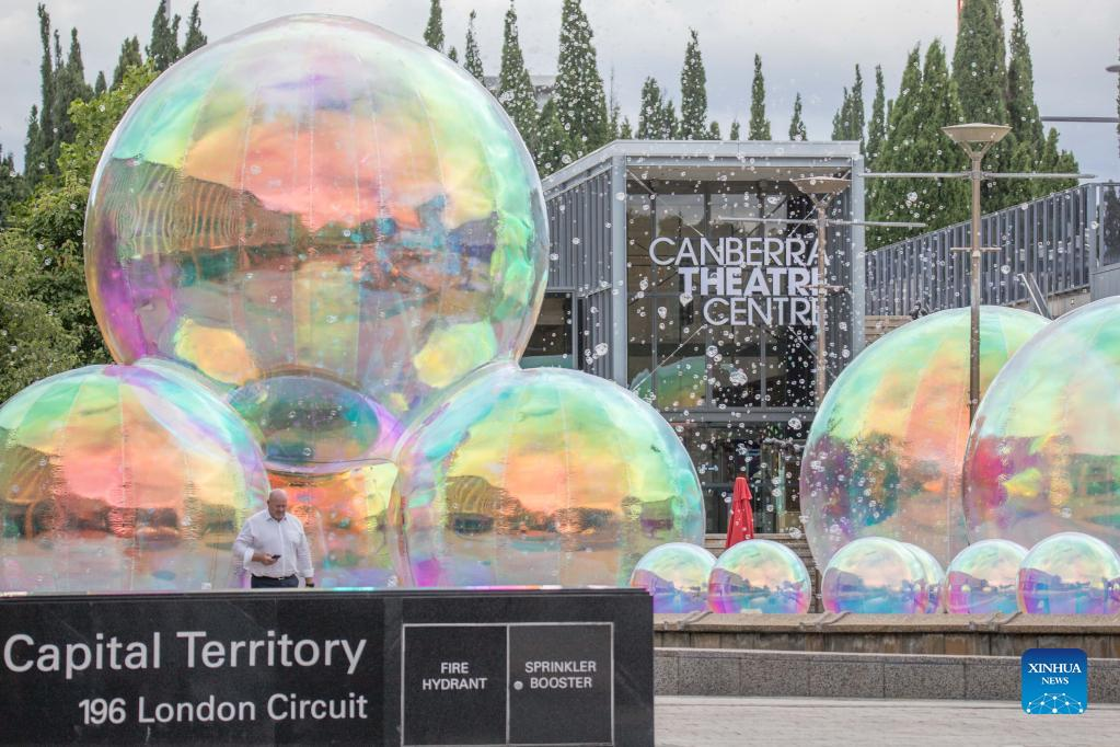 Photo taken on March 9, 2022 shows the "giant bubbles" displayed in front of the Canberra Theatre Centre during the Enlighten Festival in Canberra, Australia. The annual Enlighten Festival runs this month with landmark buildings illuminated with colorful lights. (Photo by Liu Changchang/Xinhua)