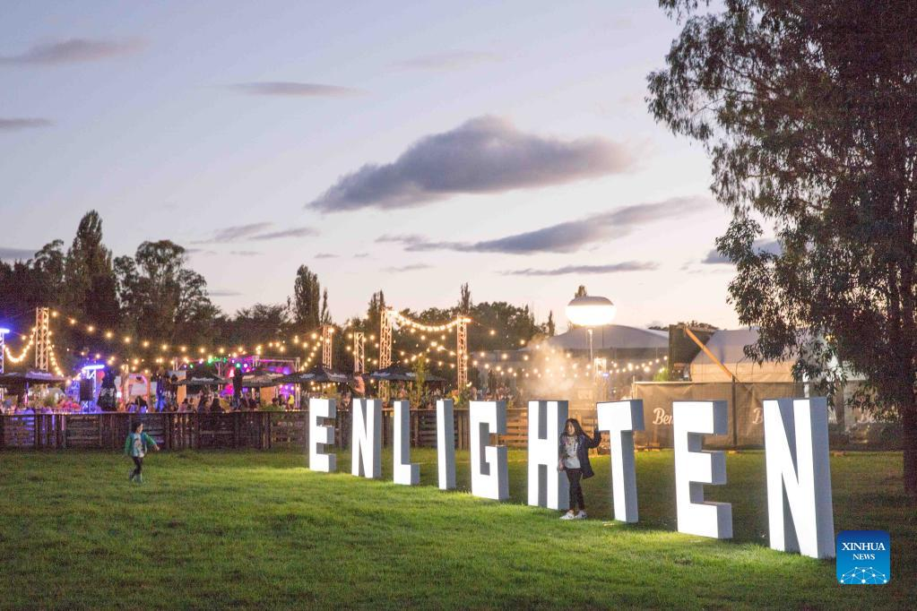 Photo taken on March 9, 2022 shows a view during the Enlighten Festival in Canberra, Australia. The annual Enlighten Festival runs this month with landmark buildings illuminated with colorful lights. (Photo by Liu Changchang/Xinhua)