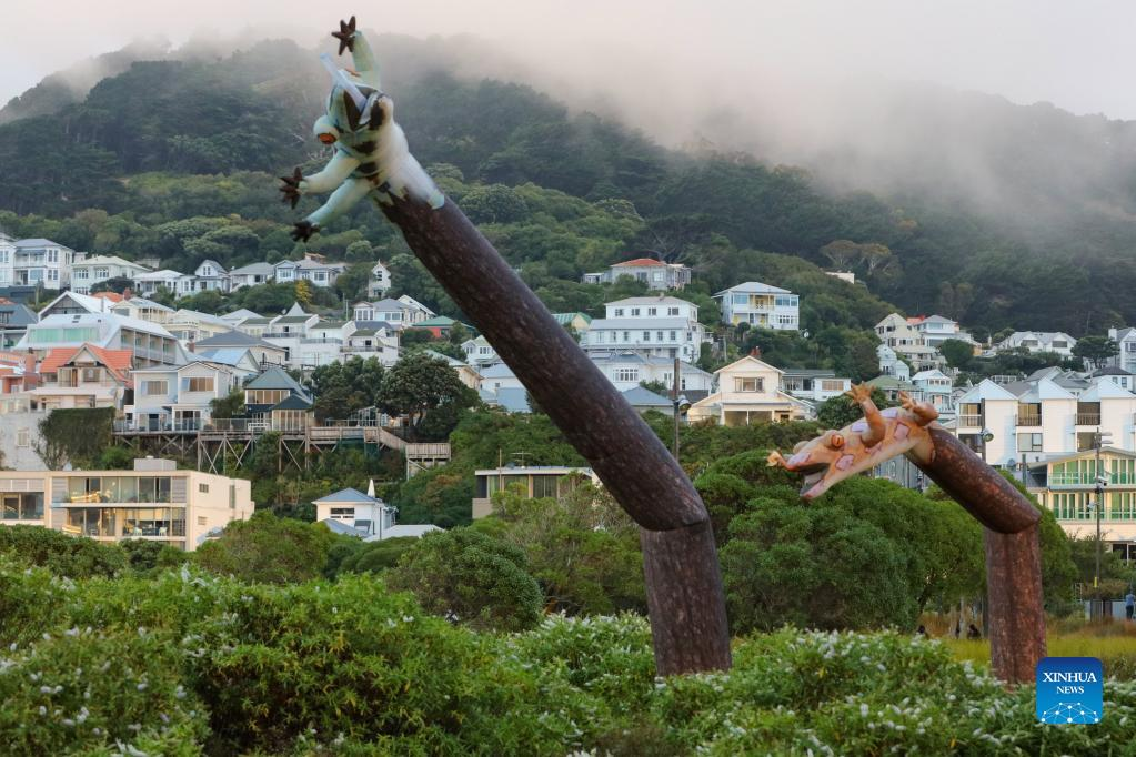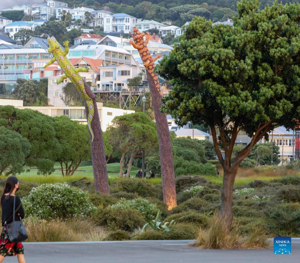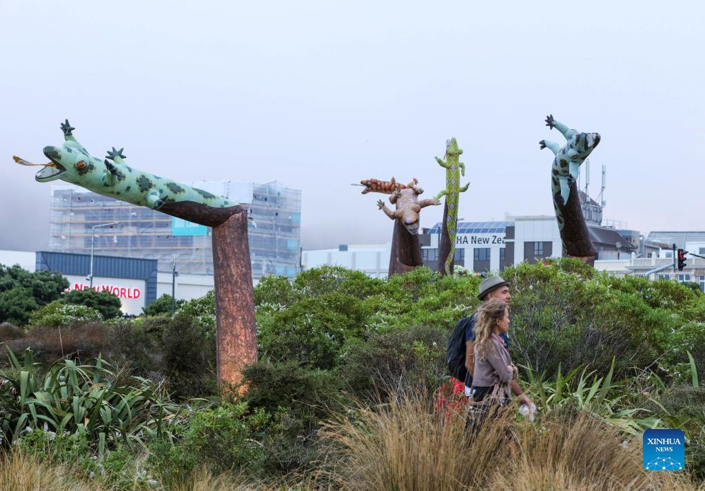 Photo taken on March 9, 2022 shows giant inflated geckos, artworks of Lisa Reihana, in Wellington, New Zealand. The Aotearoa New Zealand Festival of the Arts held from February to March saw a decrease in visitors this year due to COVID-19. (Photo by Meng Tao/Xinhua)