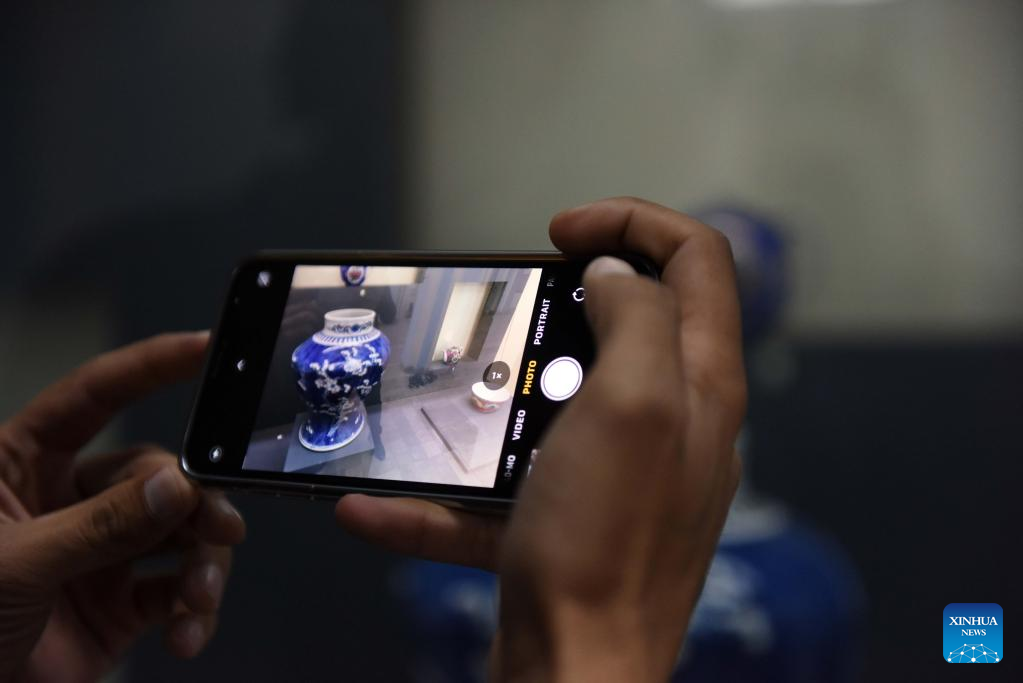 A visitor takes photos of an exhibit on the first day of an art and handicraft exhibition in the national museum in Kabul, Afghanistan, March 13, 2022. (Photo by Aria/Xinhua)