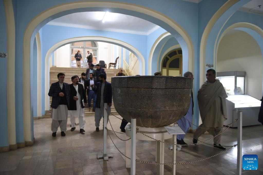 People pay a visit on the first day of an art and handicraft exhibition in the national museum in Kabul, Afghanistan, March 13, 2022. (Photo by Aria/Xinhua)