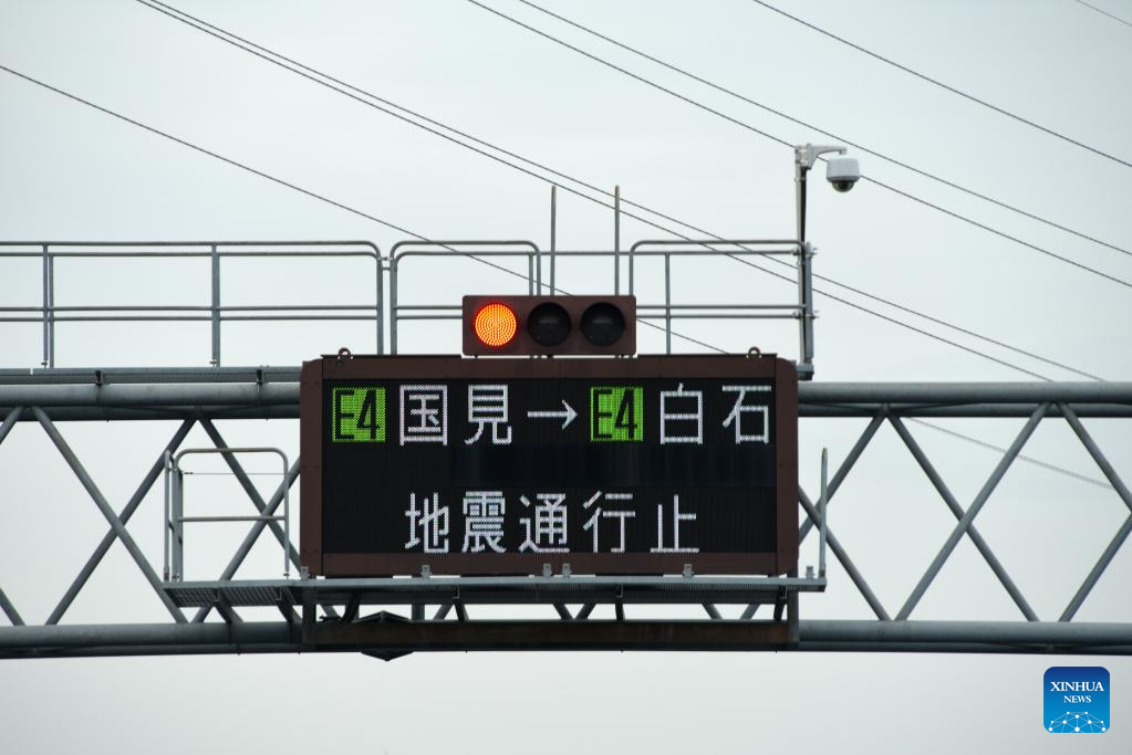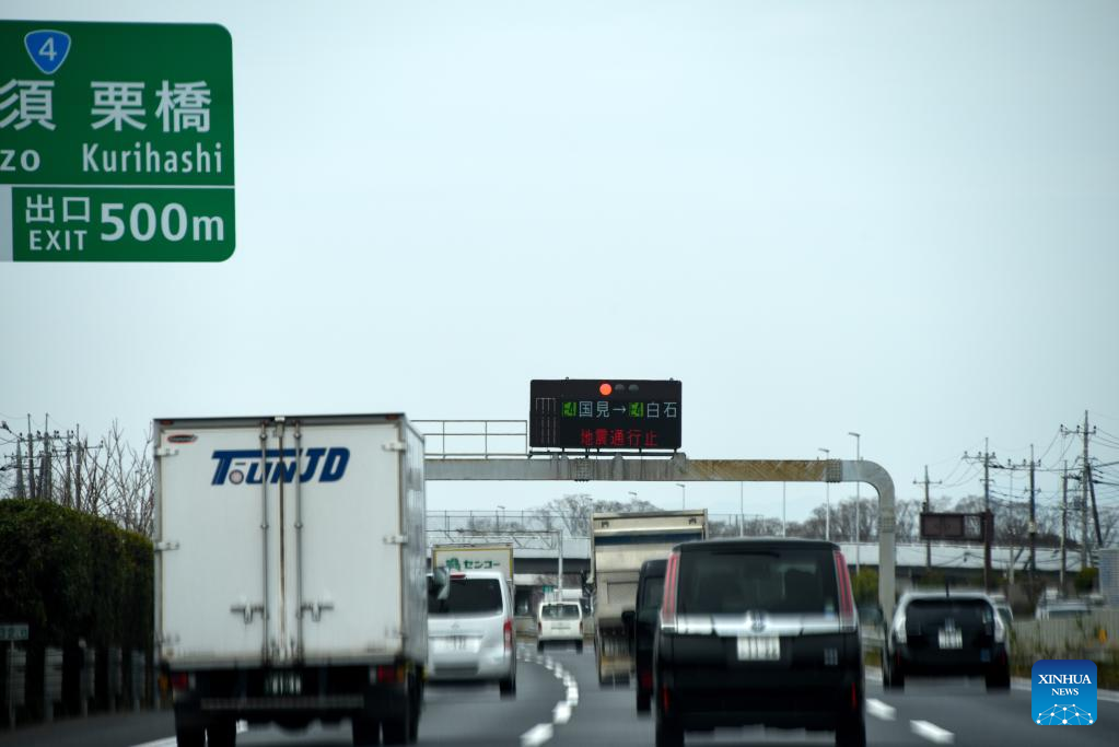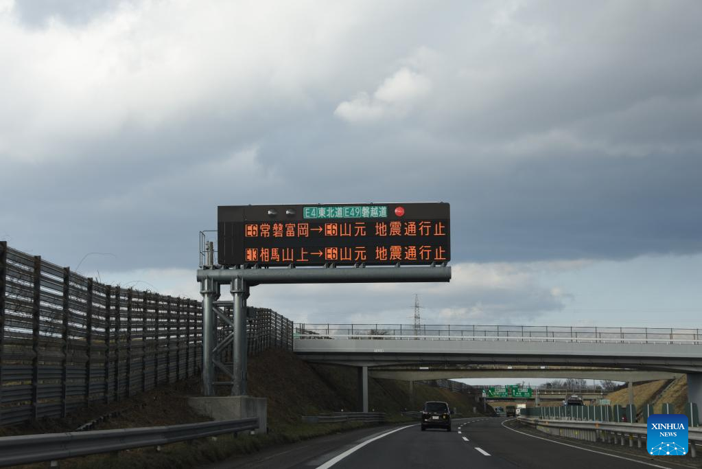 A screen over the road indicates that part of a highway is suspended due to an earthquake in Japan, March 17, 2022. Four people were killed and 97 others injured after a strong earthquake hit northeastern Japan late Wednesday night. (Xinhua/Zhang Xiaoyu)