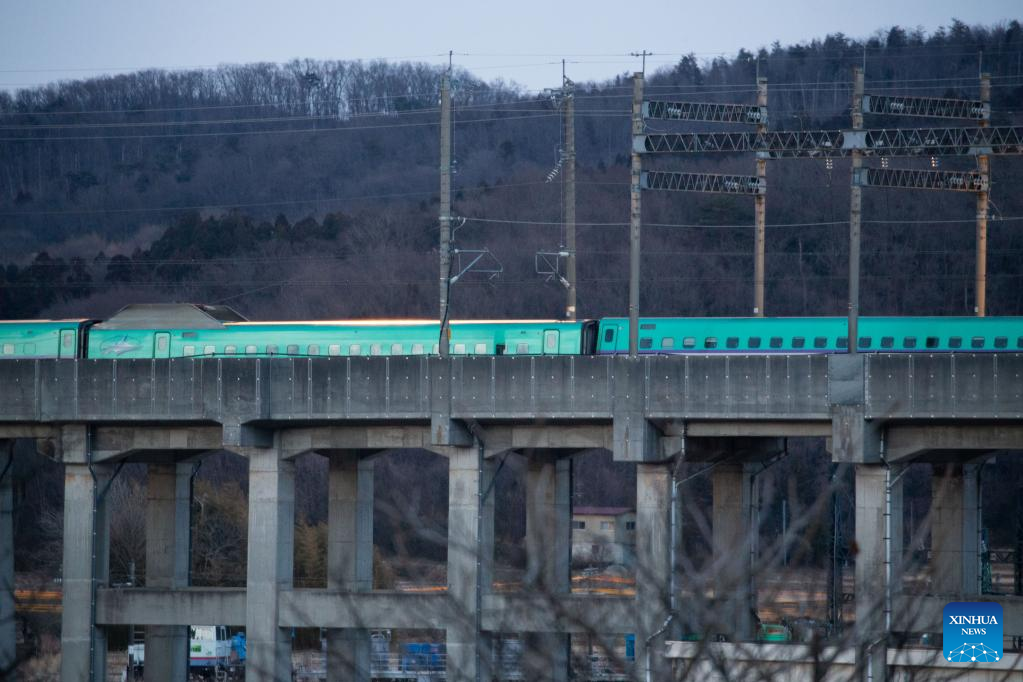 A derailed Shinkansen bullet train is pictured after an earthquake in Shiroishi City of Miyagi Prefecture, Japan, March 17, 2022. A 7.3-magnitude earthquake hit northeastern Japan on late Wednesday night. (Xinhua/Zhang Xiaoyu)