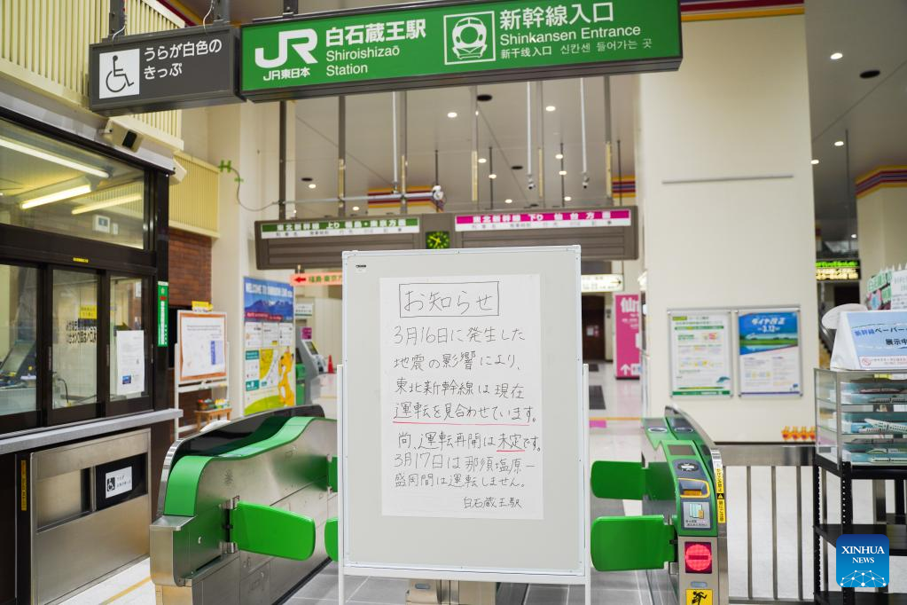 Photo taken on March 17, 2022 shows a notice informing people about the suspension of Shinkansen after an earthquake at ticket gates of a station in Shiroishi City of Miyagi Prefecture, Japan. A 7.3-magnitude earthquake hit northeastern Japan on late Wednesday night. (Xinhua/Zhang Xiaoyu)
